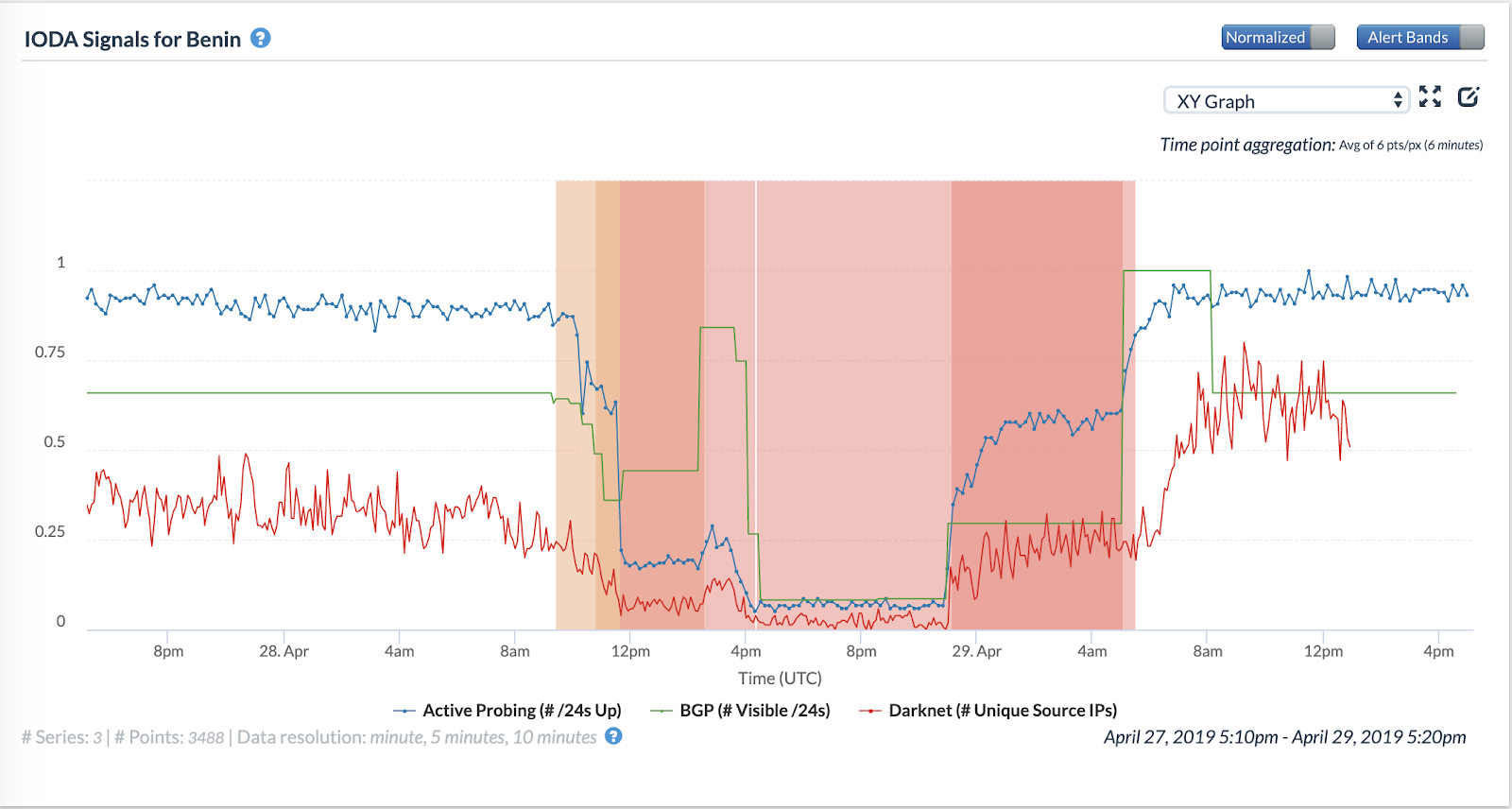 The following figures show the time series for the three data sources that IODA monitors for IP addresses belonging to different aggregates of addresses in Benin.