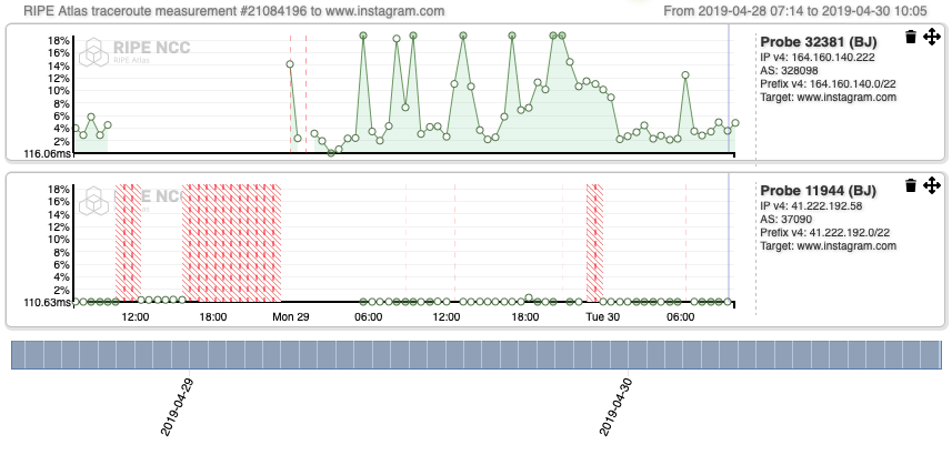 **Figure 6:**RIPE Atlas measurement, Recurring IPv4 traceroute measurement from all probes online in Benin to www.instagram.com, https://atlas.ripe.net/measurements/21084196/, April 28, 2019