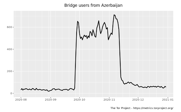 The hypothesis that the blocking attempt against Tor was ineffective is further suggested by Tor Metrics, which show a large spike in directly connecting Tor users from Azerbaijan during this period (amid the 2020 Nagorno-Karabakh war).