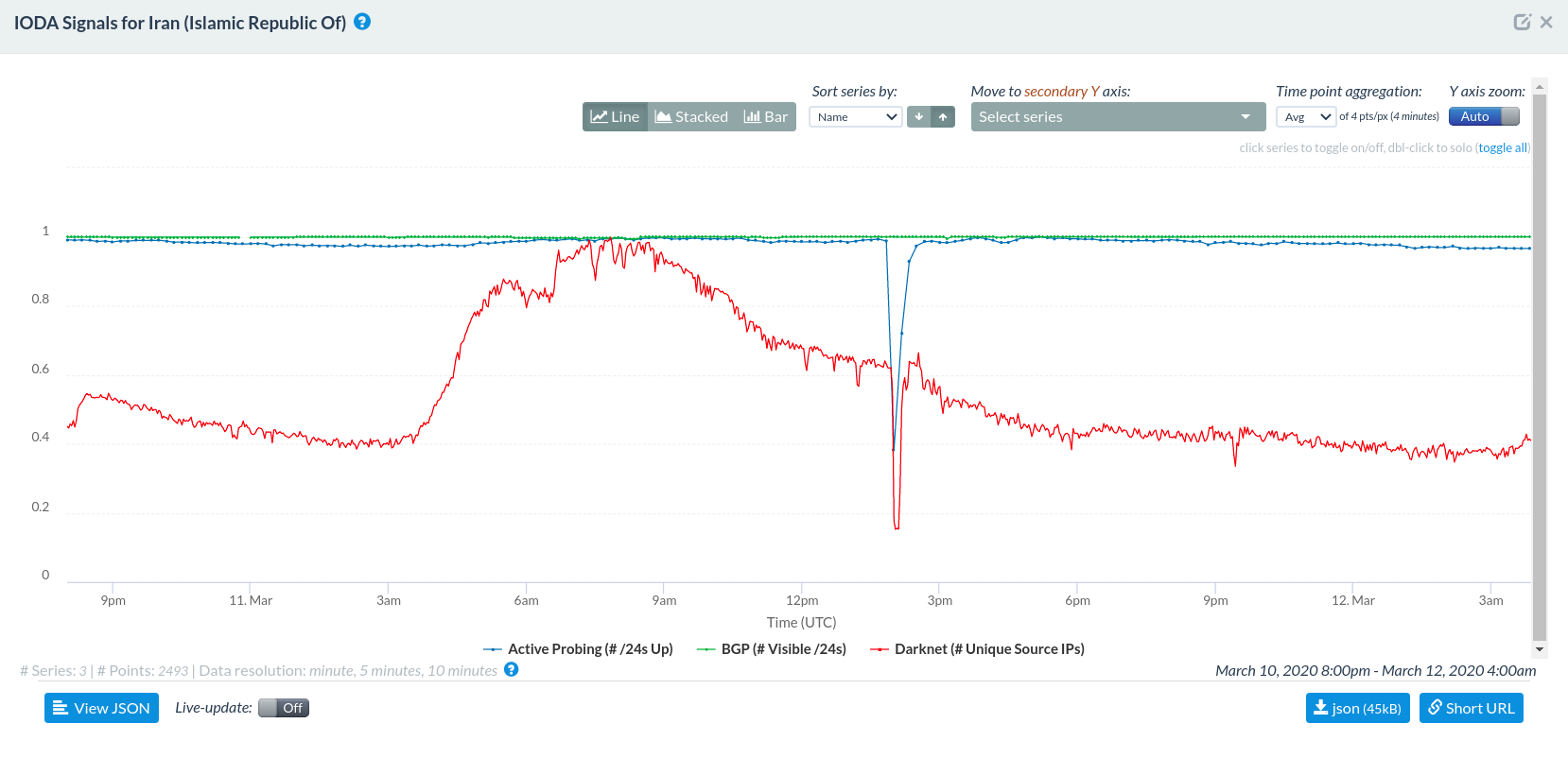 Source: Internet Outage Detection and Analysis (IODA): Iran (March 2020), https://ioda.caida.org/ioda/dashboard#view=inspect&entity=country/IR&lastView=overview&from=1583179200&until=1583208000