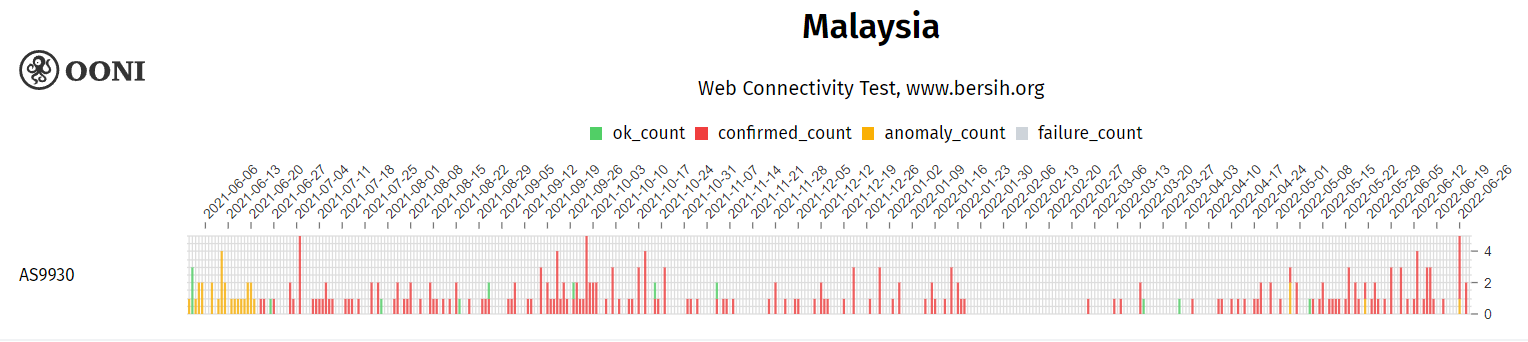 Open Observatory Network Interference. OONI Measurement Aggregation Toolkit (MAT) showing measurement collected from Malaysia on the testing of Tor from January 1st, 2022 to June 30, 2022. https://explorer.ooni.org/chart/mat?probe_cc=MY&test_name=tor&since=2022-01-01&until=2022-06-30&axis_x=measurement_start_day&axis_y=probe_cc ↩︎