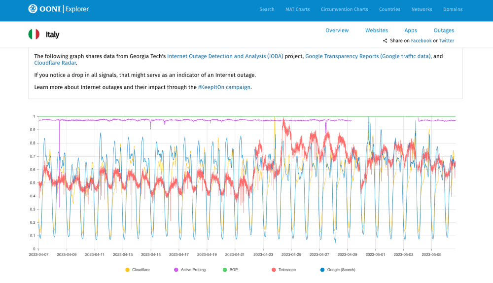 Image: Chart for monitoring internet outages in Italy based on IODA, Google traffic, and Cloudflare Radar data (source: OONI Explorer).