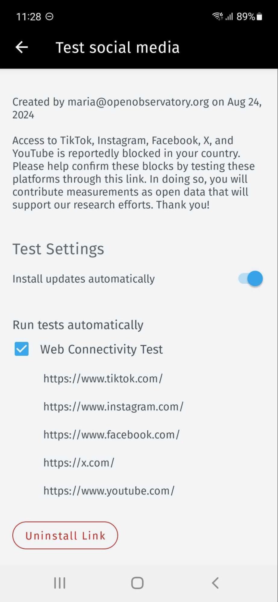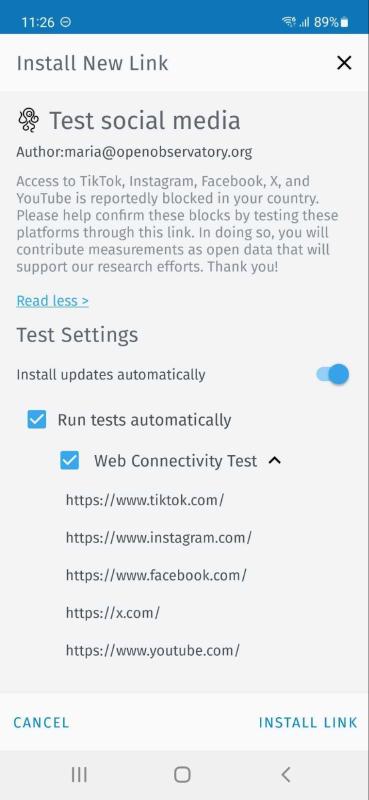 As you can see from the above example, we have opened an OONI Run link for the testing of social media in our OONI Probe Android app. This shows information about the requested testing, as well as the list of websites that we are being asked to test.