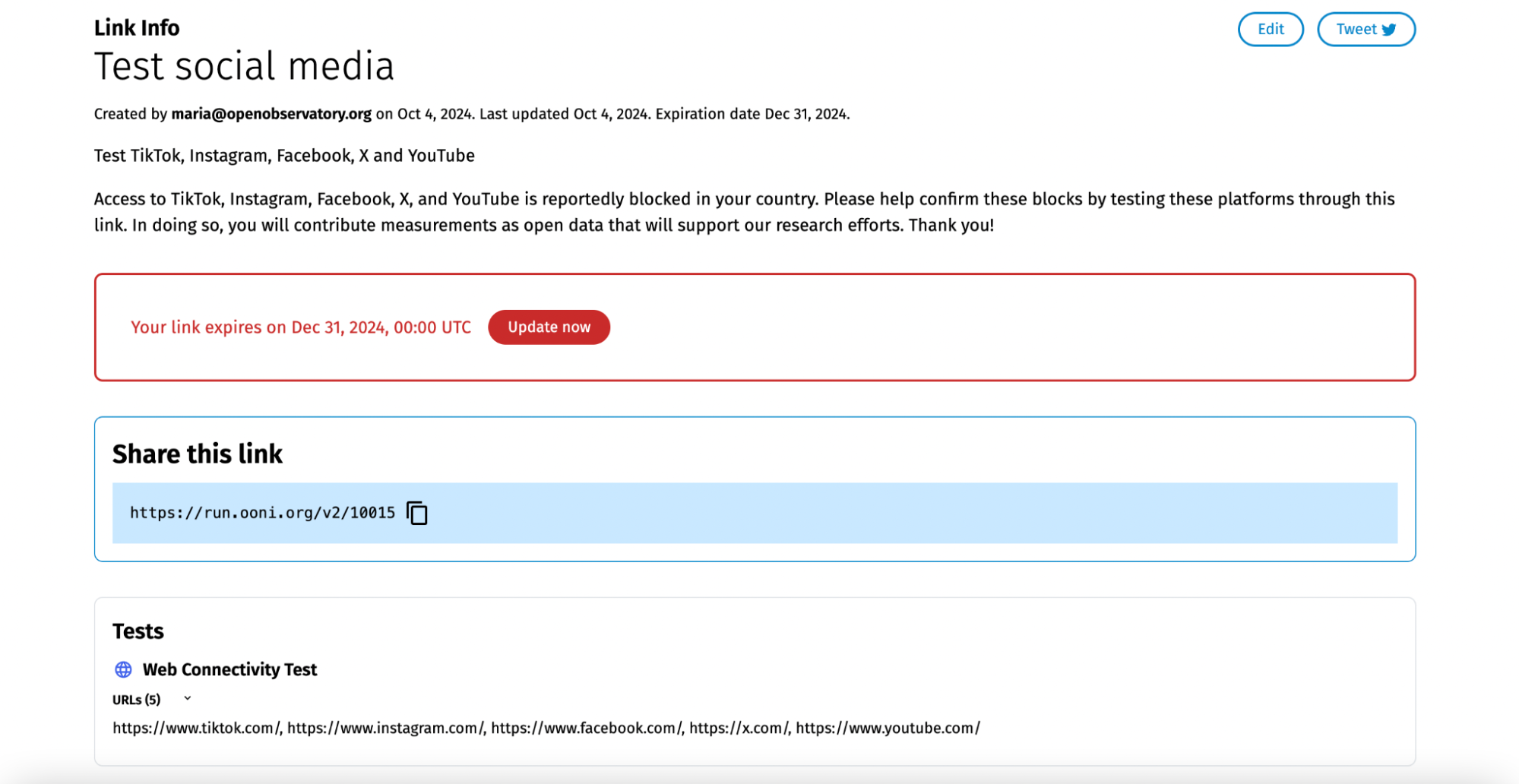 Alternatively, click the Update Now button next to the link expiration date. Both actions will enable you to edit the data in your OONI Run link.