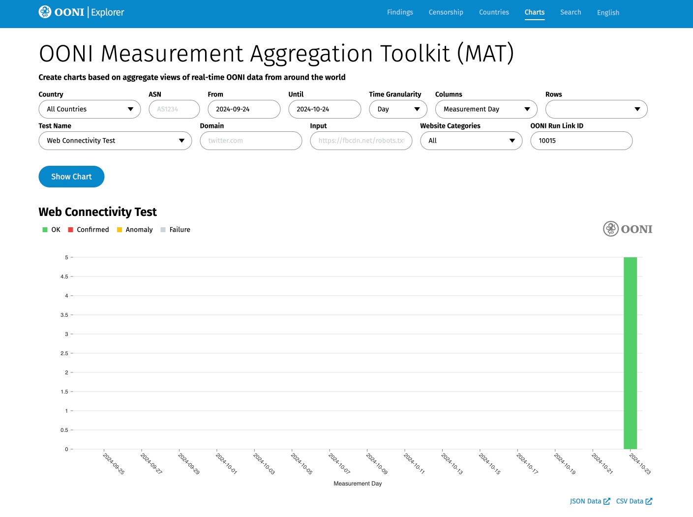 Similarly, you can use the ID of your OONI Run link to aggregate measurements from your specific OONI Run v2 link through the OONI Explorer Measurement Aggregation Toolkit (MAT). By adding the ID digits in the “OONI Run Link ID” field of the MAT and clicking Show Chart, you will generate charts that are limited to the measurements collected through your OONI Run link.
