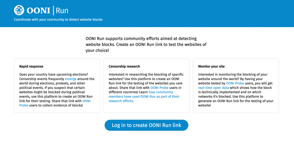 You have now logged into the OONI Run platform and can start creating OONI Run v2 links through the “Create OONI Run Link” page.