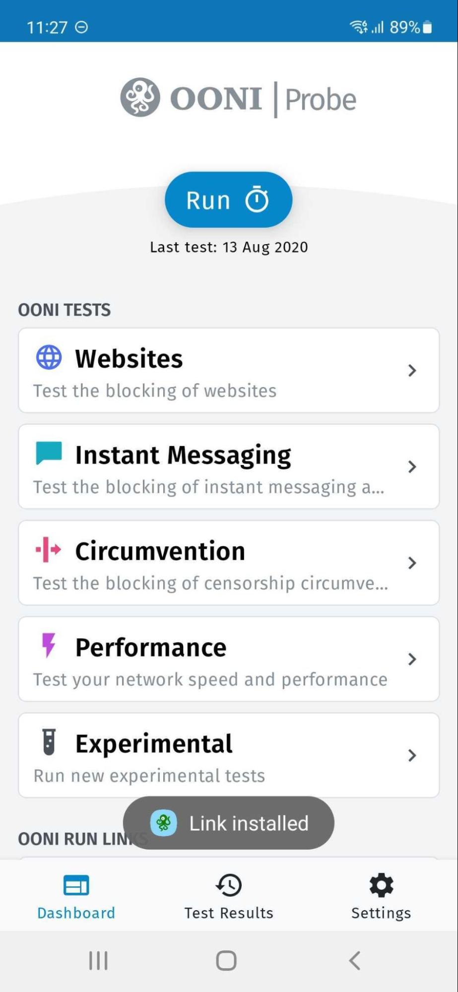 - Automated testing of OONI Run link websites. By keeping the “Run tests automatically” option enabled, the websites included in the OONI Run link will get tested automatically on an ongoing basis. That way, you don’t need to remember to re-test those websites once you have installed the OONI Run link – the OONI Probe app will do that automatically for you! We recommend keeping this option enabled to help ensure ongoing testing, greater measurement coverage, and enhanced ability to confirm potential blocks.