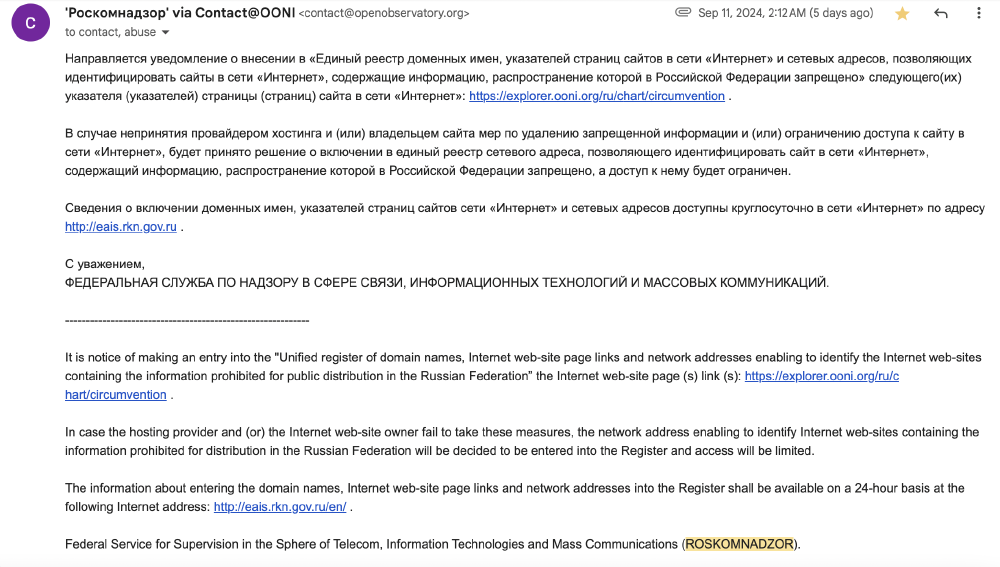 Image: Notice sent from Roskomnadzor to OONI regarding the entry of https://explorer.ooni.org/ru/chart/circumvention to Russia’s Unified Register.