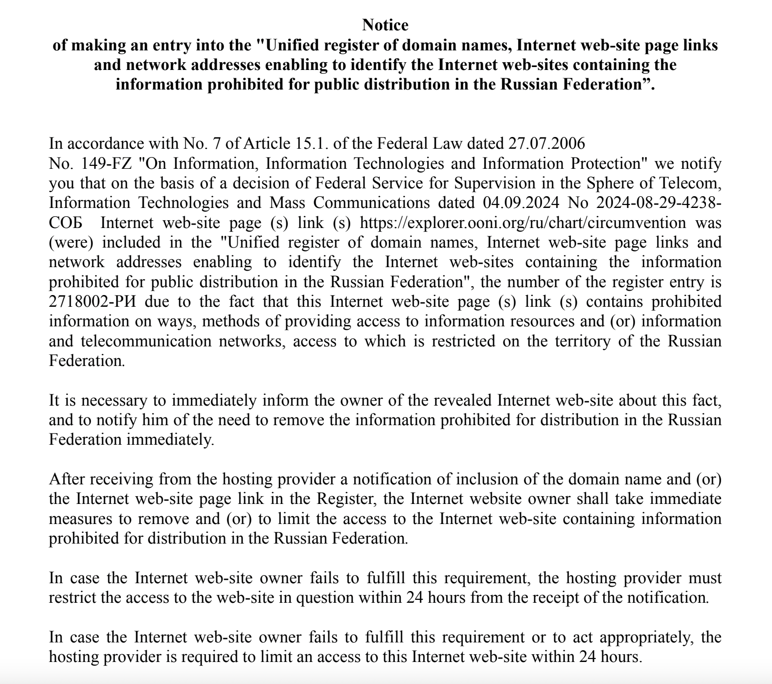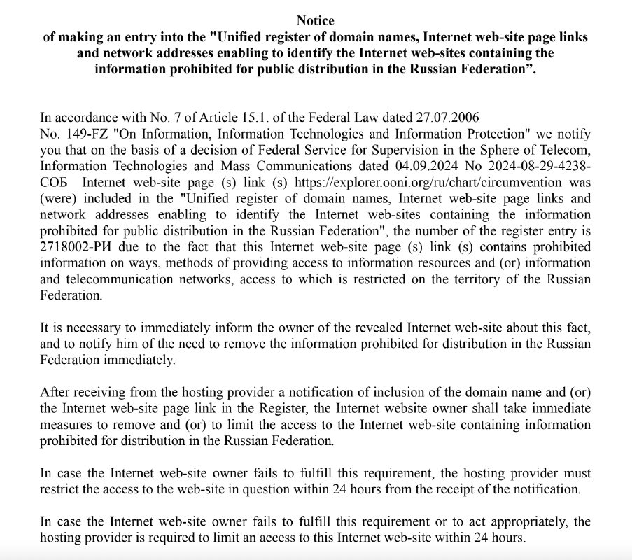 Along with their email, Roskomnadzor shared a document with us providing more details about the blocking notification. According to this document, Roskomnadzor decided on 4th September 2024 to restrict access to https://explorer.ooni.org/ru/chart/circumvention in accordance with No. 7 of Article 15.1 of the Federal Law (dated 27.07.2006 No. 149-FZ) “On Information, Information Technologies and Information Protection”. They specified that they would add https://explorer.ooni.org/ru/chart/circumvention to their blocking registry for containing prohibited information on how to circumvent internet censorship and access restricted information in Russia.