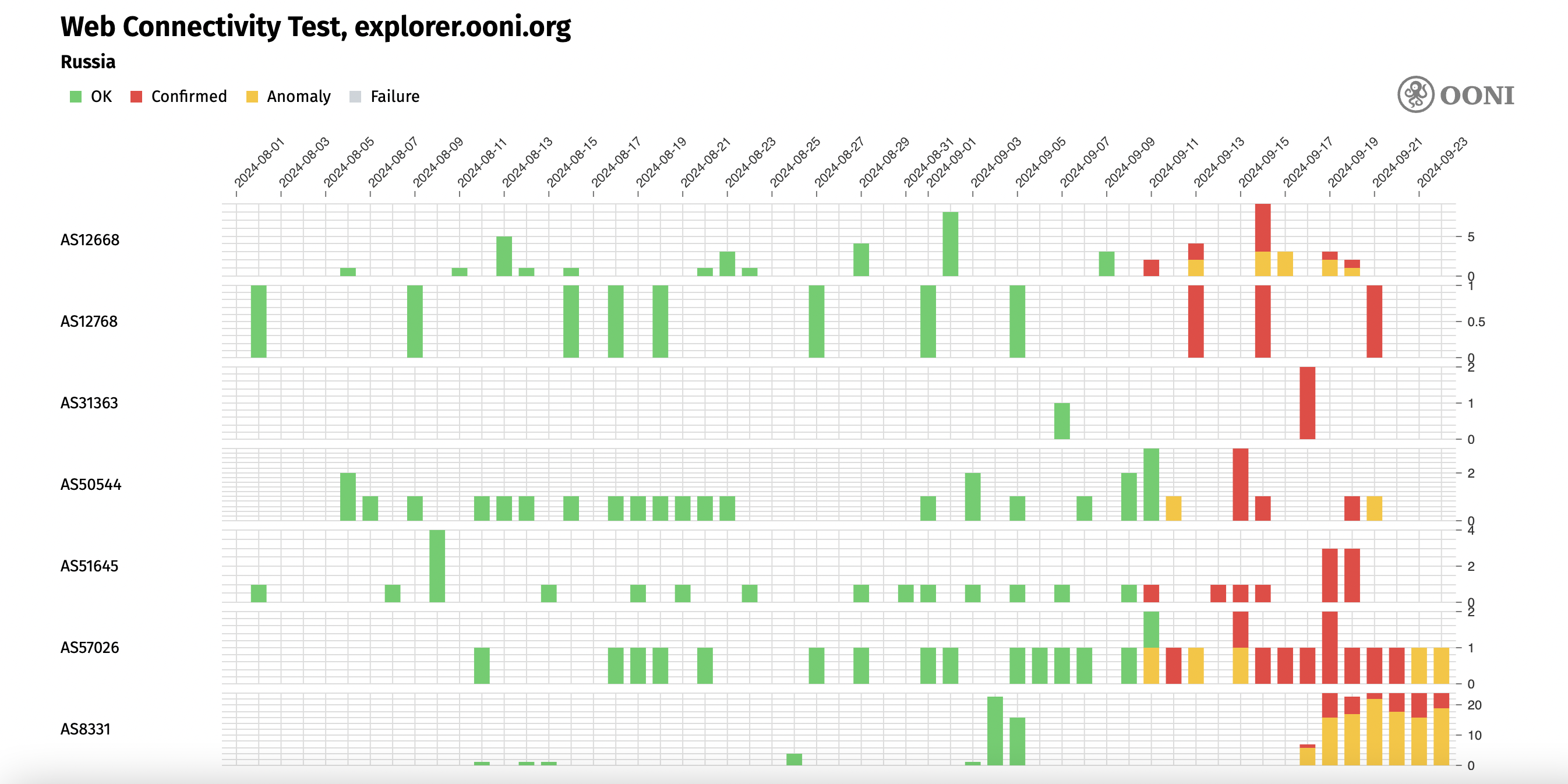 Chart: ASNs in Russia where the blocking of explorer.ooni.org is automatically confirmed based on blocking fingerprints between 1st August 2024 to 24th September 2024 (source: OONI Explorer).