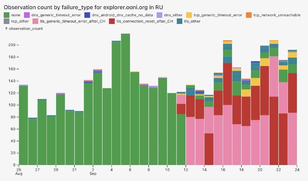 Chart: Annotation of failure types and errors in OONI measurements from the OONI Probe testing of OONI Explorer (explorer.ooni.org) in Russia between 25th August 2024 to 24th September 2024 (source: OONI data).