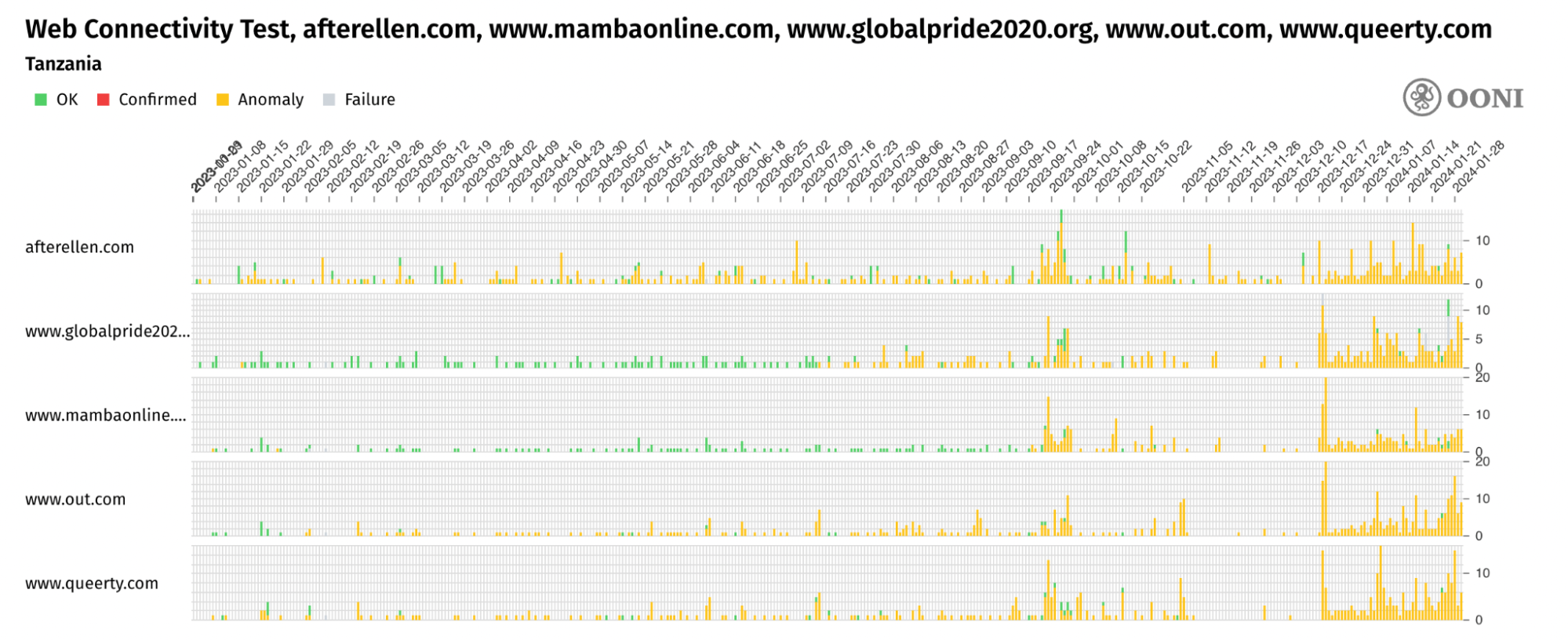 Chart: OONI Probe testing of afterellen.com, www.mambaonline.com, www.globalpride2020.org, www.out.com, www.queerty.com in Tanzania between 1st January 2023 to 31st January 2024 (source: OONI data).