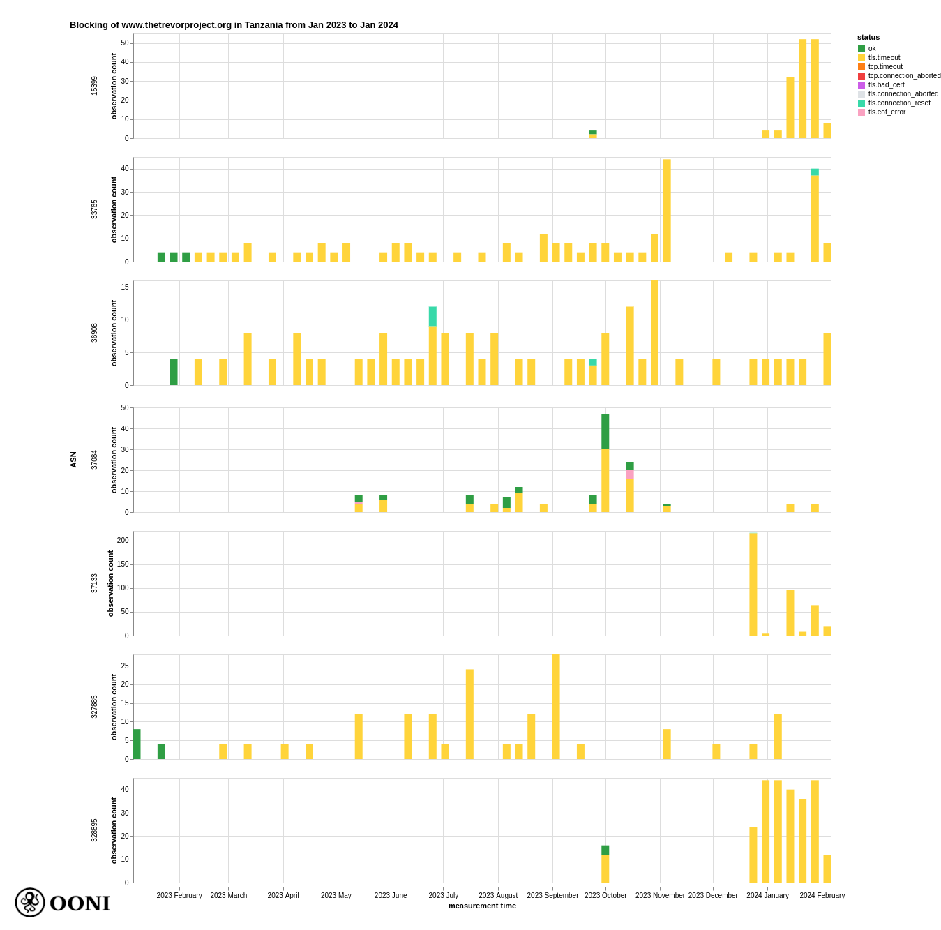 The blocking of www.thetrevorproject.org appears to have started on 7th February 2023, as OONI data provides more consistent signals of blocking thereafter. The following chart aggregates OONI measurement coverage from the OONI Probe testing of www.thetrevorproject.org on 15 networks in Tanzania between 1st January 2023 to 31st January 2024.