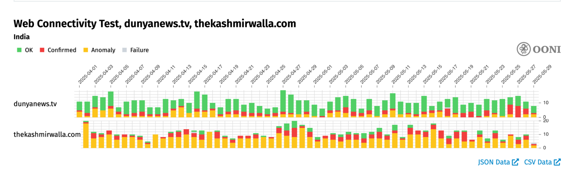 Chart: OONI Probe testing of timesofindia.indiatimes.com and www.hindustantimes.com in Pakistan between 1st April 2025 to 29th May 2025 (source: OONI data).