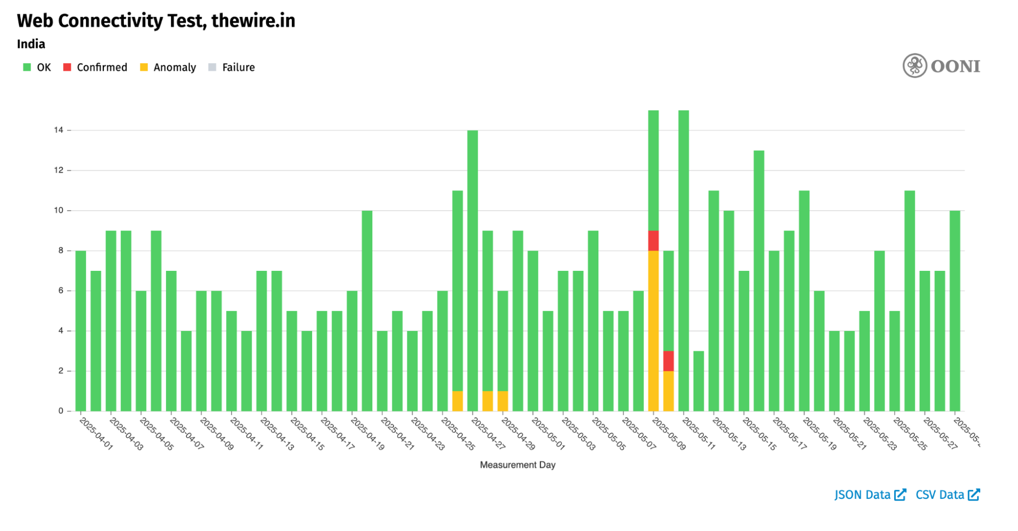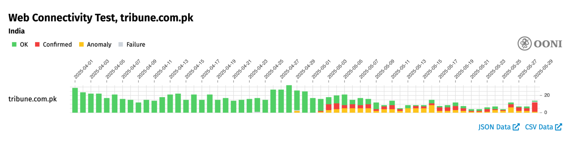 Chart: OONI Probe testing of indianexpress.com and www.indiatvnews.com in Pakistan between 1st April 2025 to 29th May 2025 (source: OONI data).